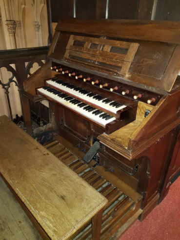 d’accompagnement *. La console est placée contre l’orgue et est typique de la